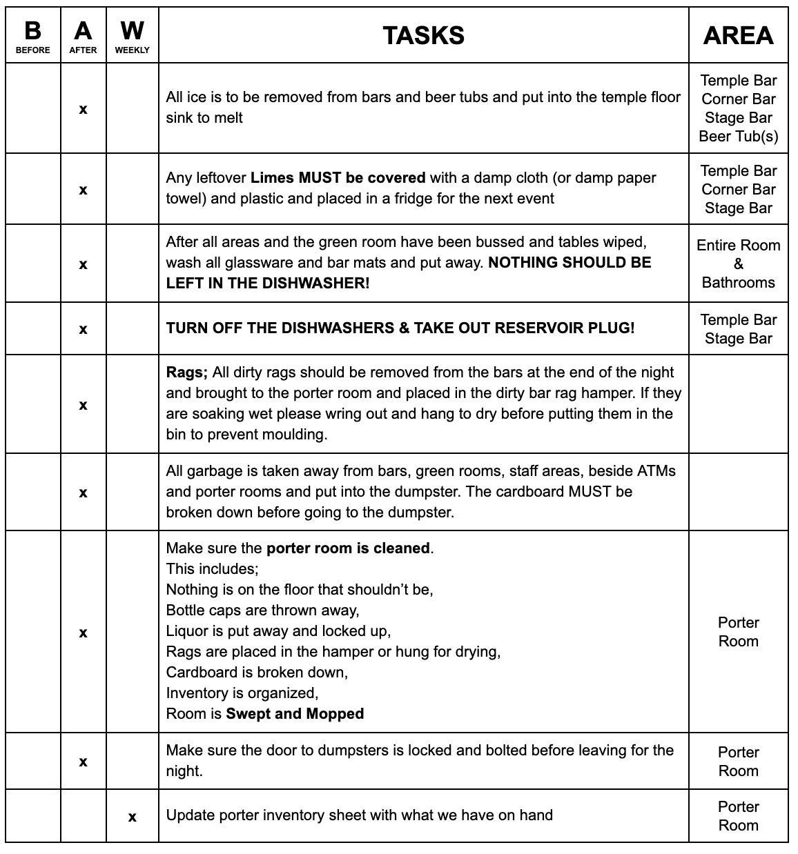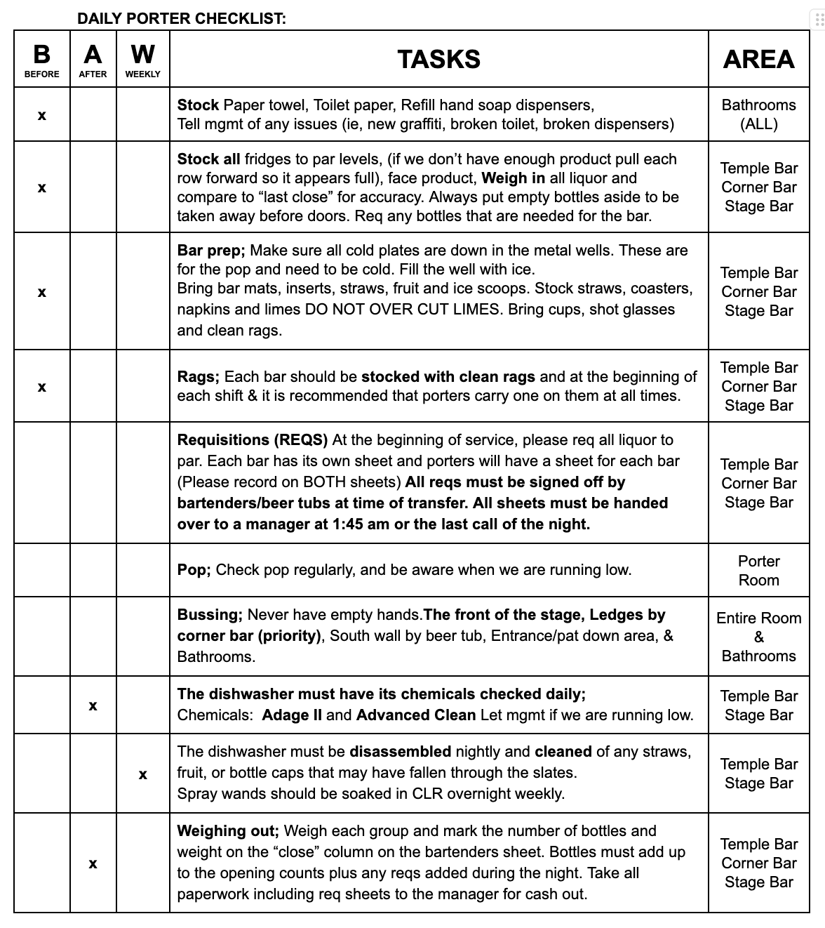 All porters have the responsibility of thoroughly cleaning and closing down the bar at the end of the night. This includes weighing out each bar, wiping the counters, washing and putting away all glassware and tearing down the dishwashers. Please refer to Porter Duties checklist for a complete overview.
